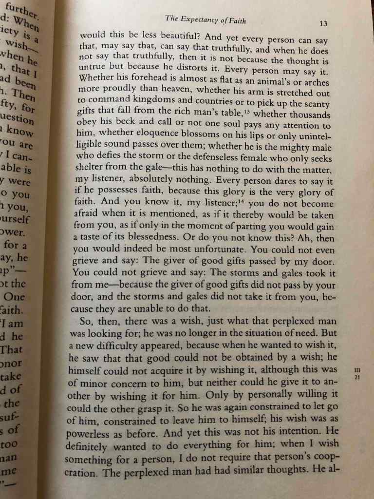 In part 1 of the episode, “The Expectancy of Faith” opened with a prayer, and then Kierkegaard spoke about wishes and wishing, and the desire to wish something appropriate for those we love the most, and the difficulty of wishing something specific for an uncertain future.